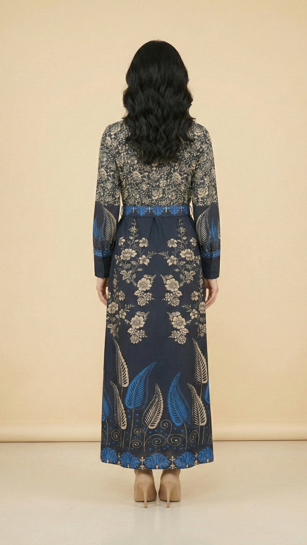 ياقة وأكمام: ياقة كلاسيكية مع أكمام طويلة وأساور محكمة تضيف لمسة من الرقي الخالد.