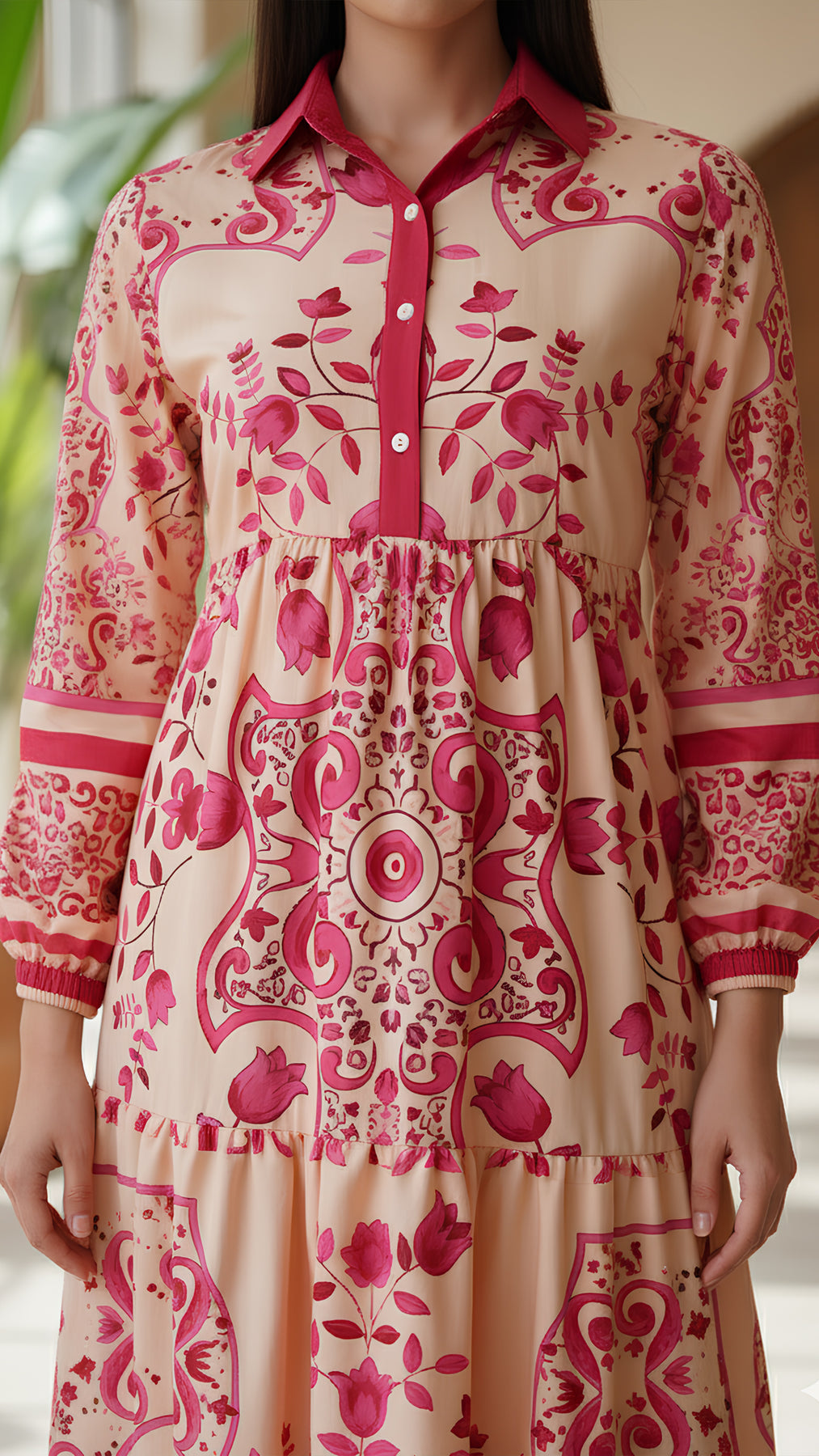 فستان فلور روز يجسد جوهر الأناقة الأنثوية بتصميمه الزهري الوردي الناعم وقصته الرشيقة. مثالي للخروجات اليومية والمناسبات الخاصة، ويوفر راحة وسحراً خالداً. فستان زهري وردي أنيق للنساء اللاتي يعشقن الرقي بلا عناء.