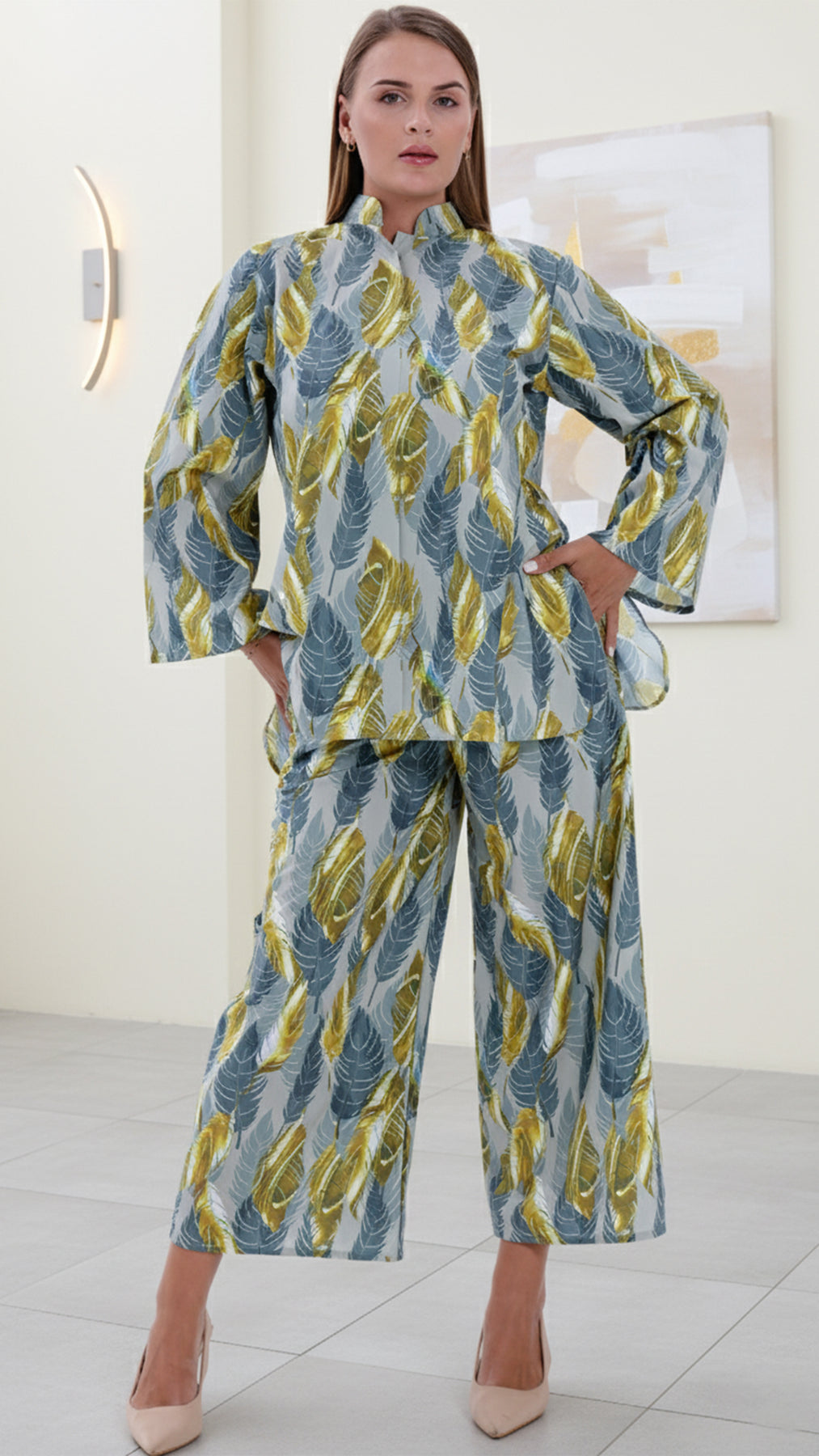 Fit: Relaxed silhouette with a fluid top and wide-leg pants for all-day comfort.