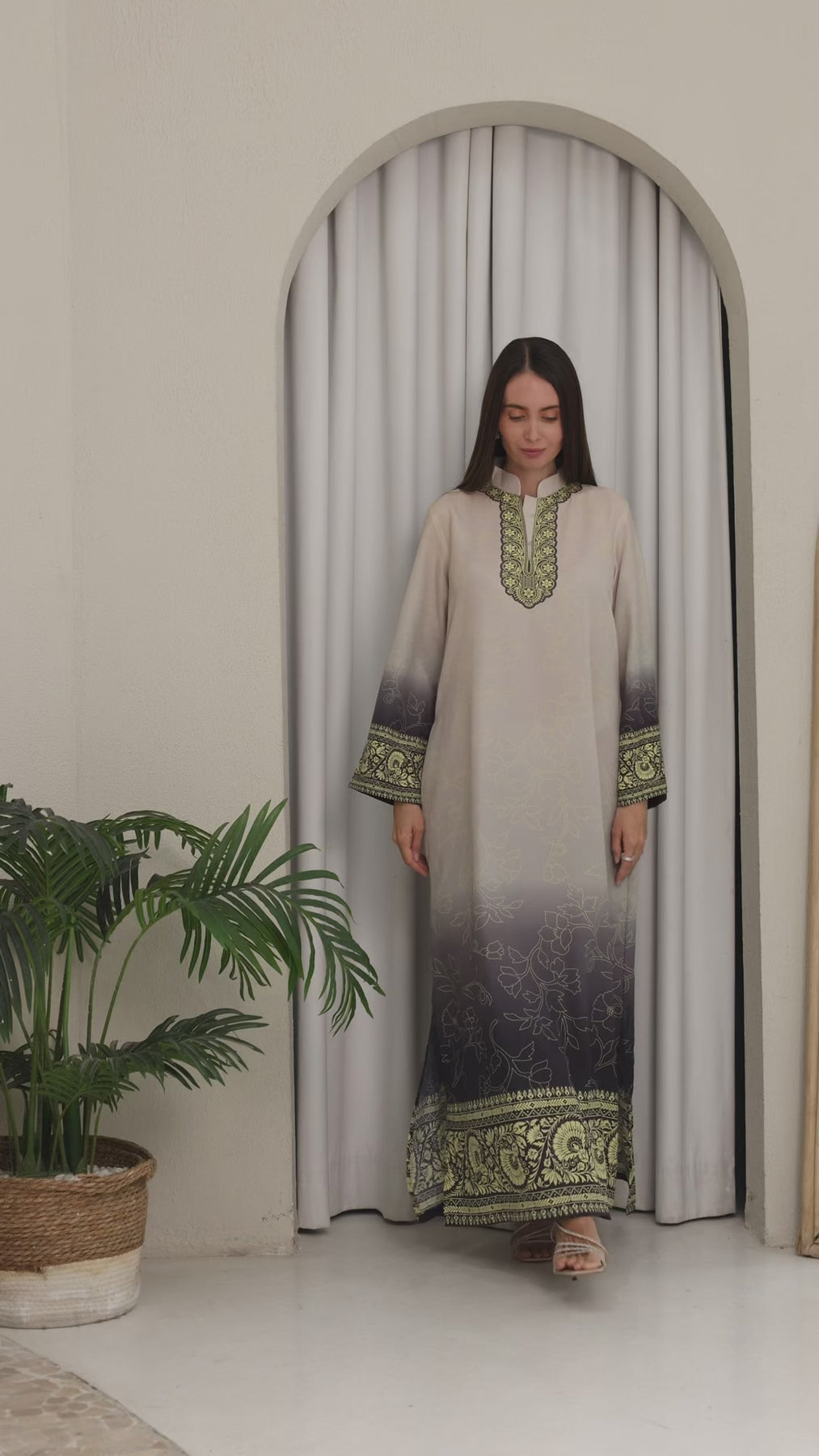 Liorvane Kaftan Dress features a flowing silhouette adorned with intricate metallic detailing and subtle tonal floral patterns for a polished, luxurious finish. Designed to balance soft gradients with artisanal elegance, it exudes effortless sophistication.