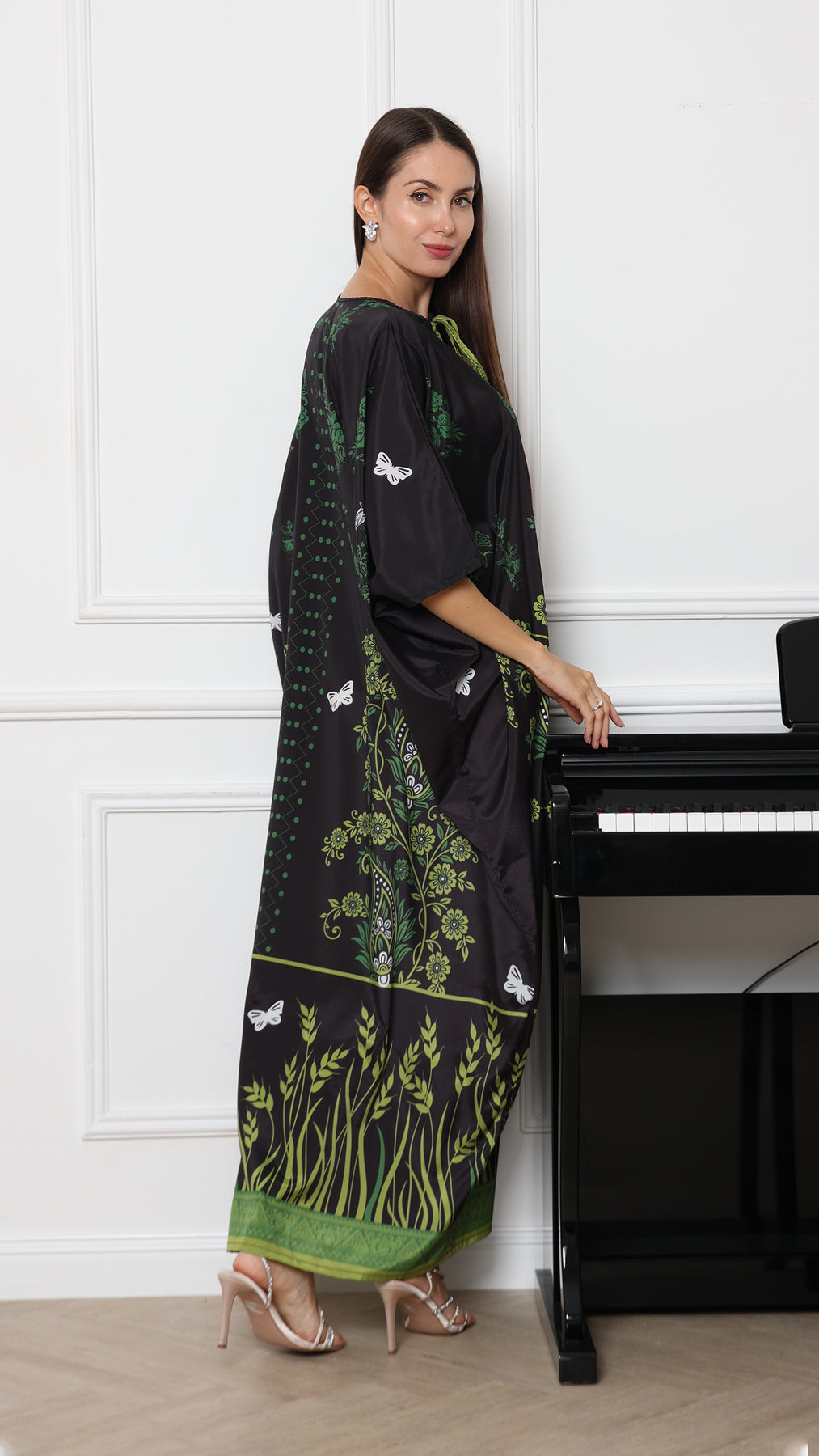 Make a memorable entrance with this exquisite kaftan, showcasing a bold black base illuminated by a vibrant lime green floral and butterfly print. The airy fabric is tailored to drape dramatically, ensuring both an opulent look and a comfortable feel, day or night.