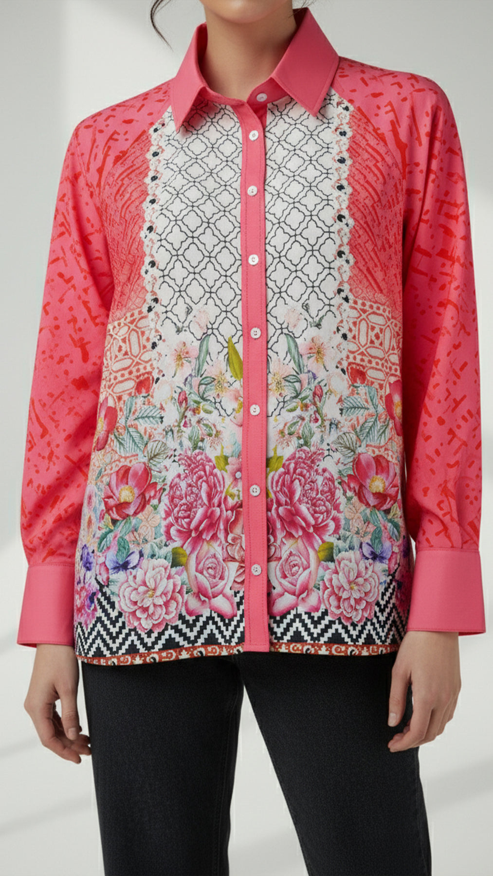 Ravisse Button-Down Shirt radiates confidence and charm with its vivid fusion of hot pink and expressive floral motifs. Accented by bold geometric borders, it strikes the perfect balance between playful vibrance and refined elegance. A true statement piece — crafted for women who embrace color, creativity, and effortless sophistication.